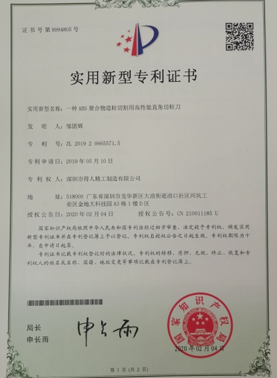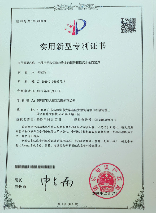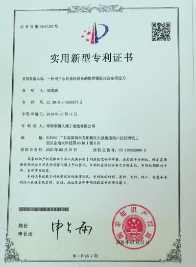 得人精工合金固定刀专利证书