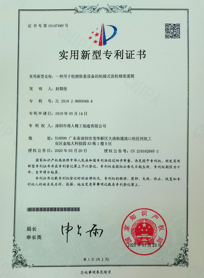 得人精工齿轮精密滚筒专利
