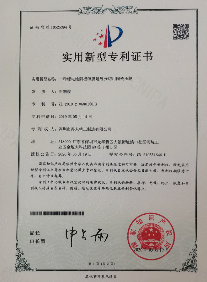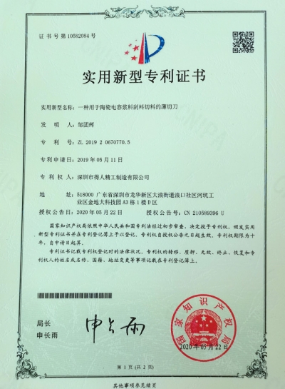 得人精工流延刀刮料刀专利证书